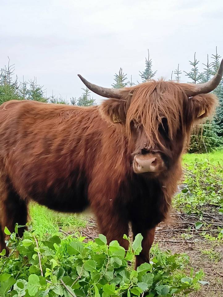 Choć to krówki, porównanie do żubrów wcale nie jest przypadkowe – rude Highland Cattle mają imponujące rogi, gęstą sierść i posturę, której nie sposób nie zauważyć na tle sierpniowych pól.