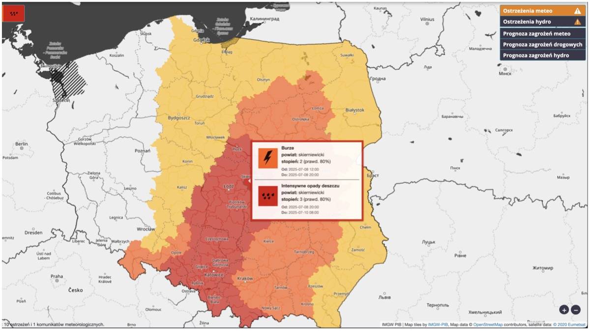 Najpoważniejsze z ostrzeżeń – III stopnia – dotyczy intensywnych opadów deszczu i obowiązuje na terenie całego województwa łódzkiego. Rozpocznie się we wtorek, 8 lipca, o godzinie 20:00 i potrwa do czwartku, 10 lipca, do godziny 08:00.