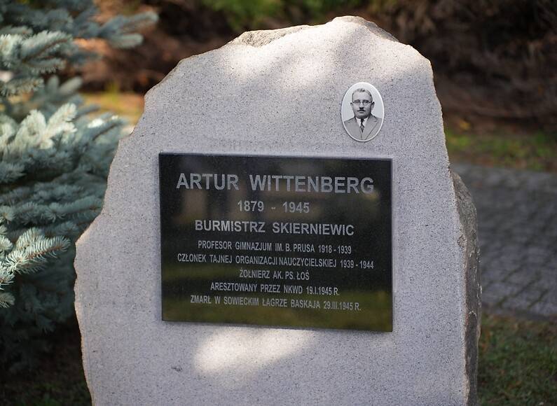 Pierwszą tablicę w Miejscu Pamięci poświęcono Arturowi Wittenbergowi - wybitnemu nauczycielowi, społecznikowi i patriocie.Urodzony 10 grudnia 1879 roku w Nieszawie, od 1918 roku związany był ze Skierniewicami, gdzie uczył języka niemieckiego w gimnazjum i liceum im. Bolesława Prusa. Był niezwykle lubiany przez uczniów, którzy nazywali go z sympatią „Tatą".Podczas okupacji prowadził tajne nauczanie, odmówił podpisania volkslisty i działał w Armii Krajowej pod pseudonimem „Łoś". Pełnił funkcję zastępcy, a następnie burmistrza Skierniewic, pomagając ludności cywilnej, wysiedlonym i uchodźcom z Warszawy. W styczniu 1945 roku został aresztowany przez NKWD i wywieziony do łagru w Baskaji na Uralu, gdzie zmarł z wycieńczenia 29 marca 1945 roku. Pośmiertnie został odznaczony Złotym Krzyżem Zasługi, a w 1946 roku otrzymał tytuł Honorowego Obywatela Miasta Skierniewice. Jego imieniem nazwano jedną z miejskich ulic.